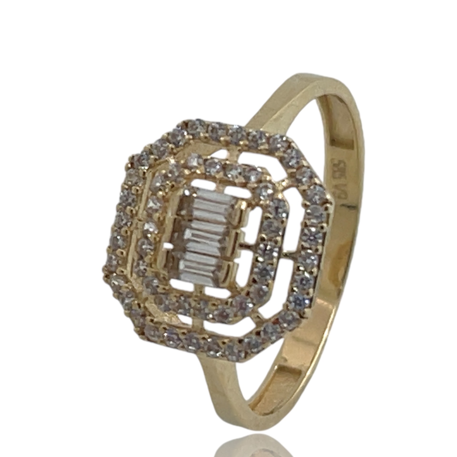 Deze prachtige gouden aanzoeksring is voorzien van schitterende baguette zirkonia stenen. De ring straalt elegantie en luxe uit en is perfect voor een romantisch aanzoek. Draag deze ring aan je ringvinger en laat de fonkelende stenen de aandacht trekken. De perfecte manier om je liefde te bezegelen en een onvergetelijk moment te creëren.