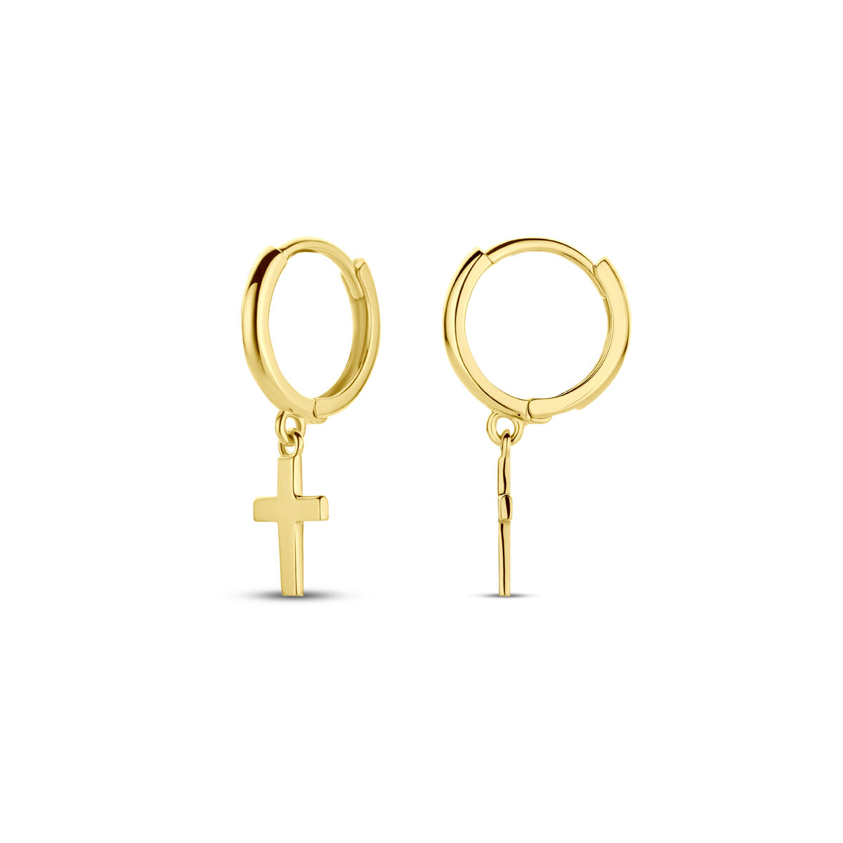 14k Geelgouden klapoorringen met een kruis. Het kruis heeft een afmeting van 9x6mm. De oorringen hebben een diameter van 11mm.