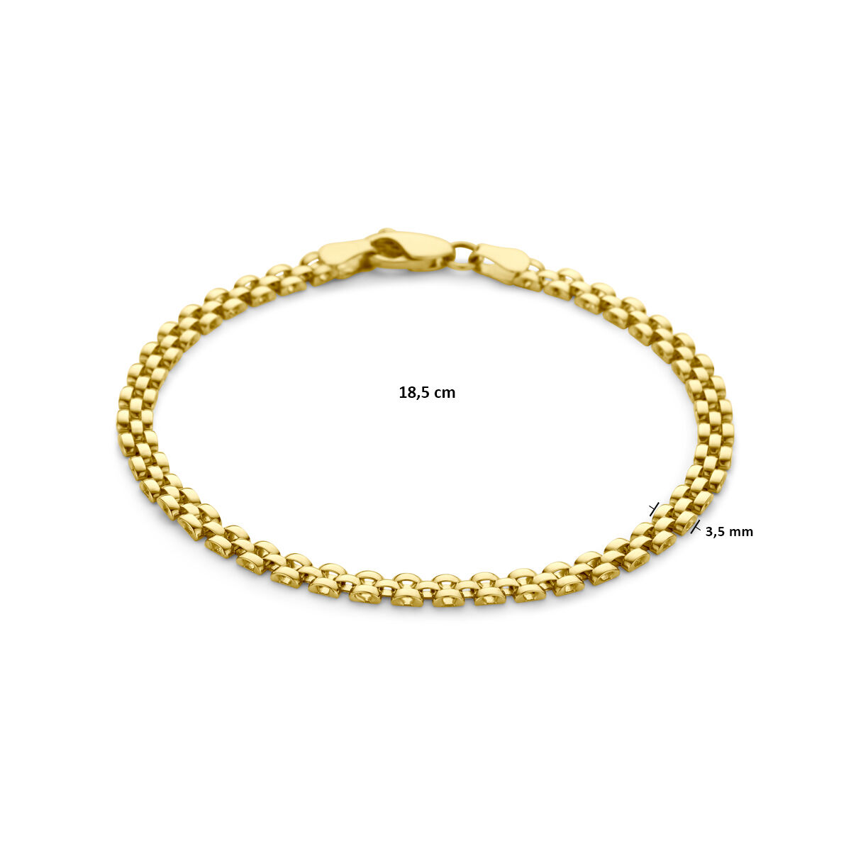 14k Geelgouden armband met een schakelbreedte van 3.5mm en een draaglengte van 18.5cm. Uitgevoerd met een karabijn sluiting.