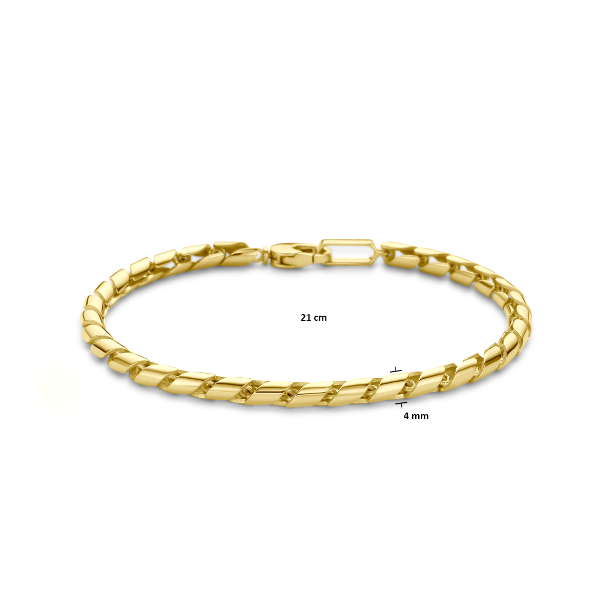 14k Geelgouden armband met een schakelbreedte van 4mm en draaglengte van 21cm. Uitgevoerd met karabijnsluiting.