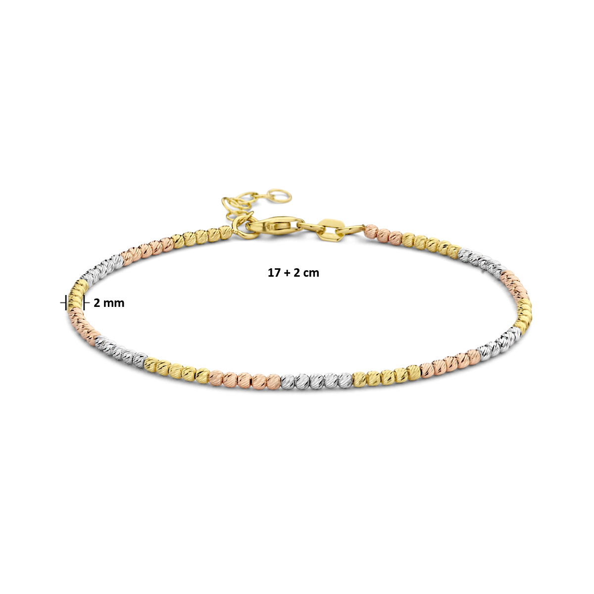 14k Tricolor wit-, rose- en geelgouden armband uitgevoerd met bolletjes en een karabijn sluiting. De armband heeft een draaglengte van 17cm met een extensie van 2cm en een schakelbreedte van 2mm.