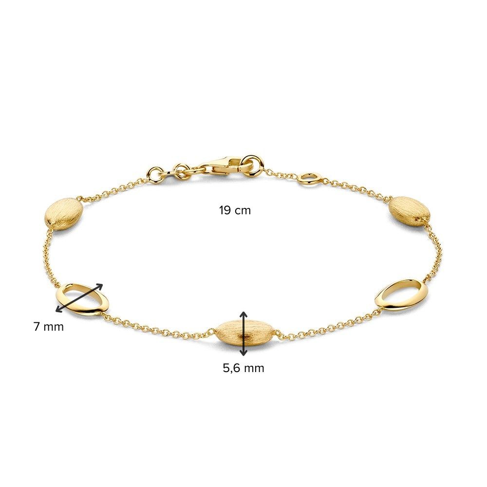 Stijlvolle geelgouden armband met speelse elementen in gematteerde en gepolijste afwerking.