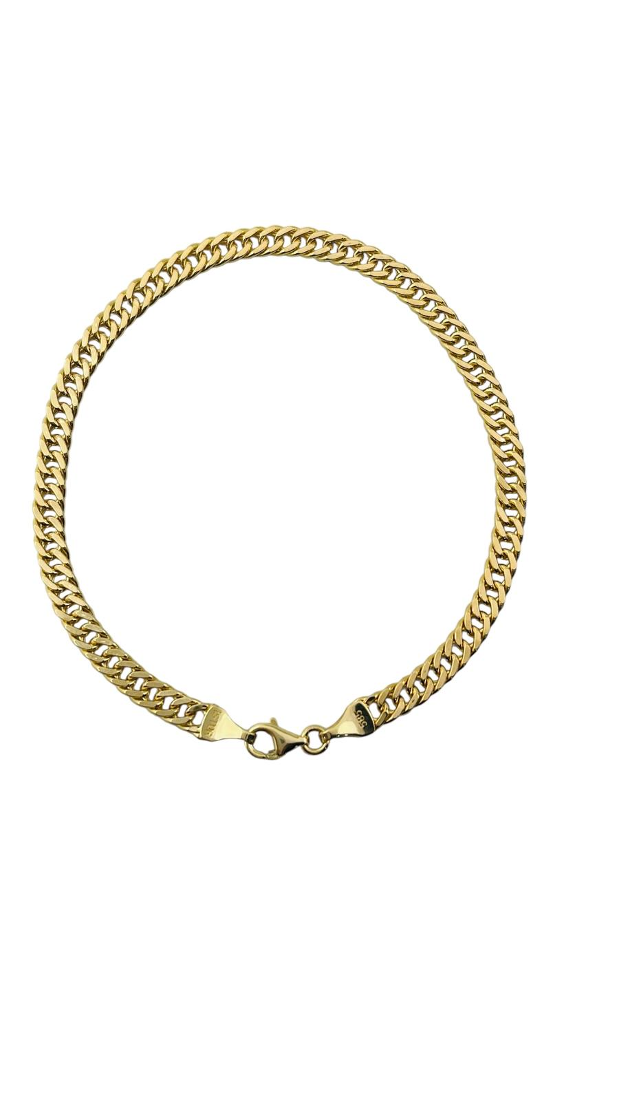 De armband platte gourmette 4.25mm, modelnummer ARMBAND GOURMETTE, is een elegante geelgouden gourmette-armband van 14 karaat. Het ontwerp heeft een breedte van 4,25 mm en is voorzien van een stevige karabijnsluiting. Met een lengte van 20 cm is deze tijdloze armband perfect om dagelijks te dragen of als chique toevoeging aan een avondoutfit.