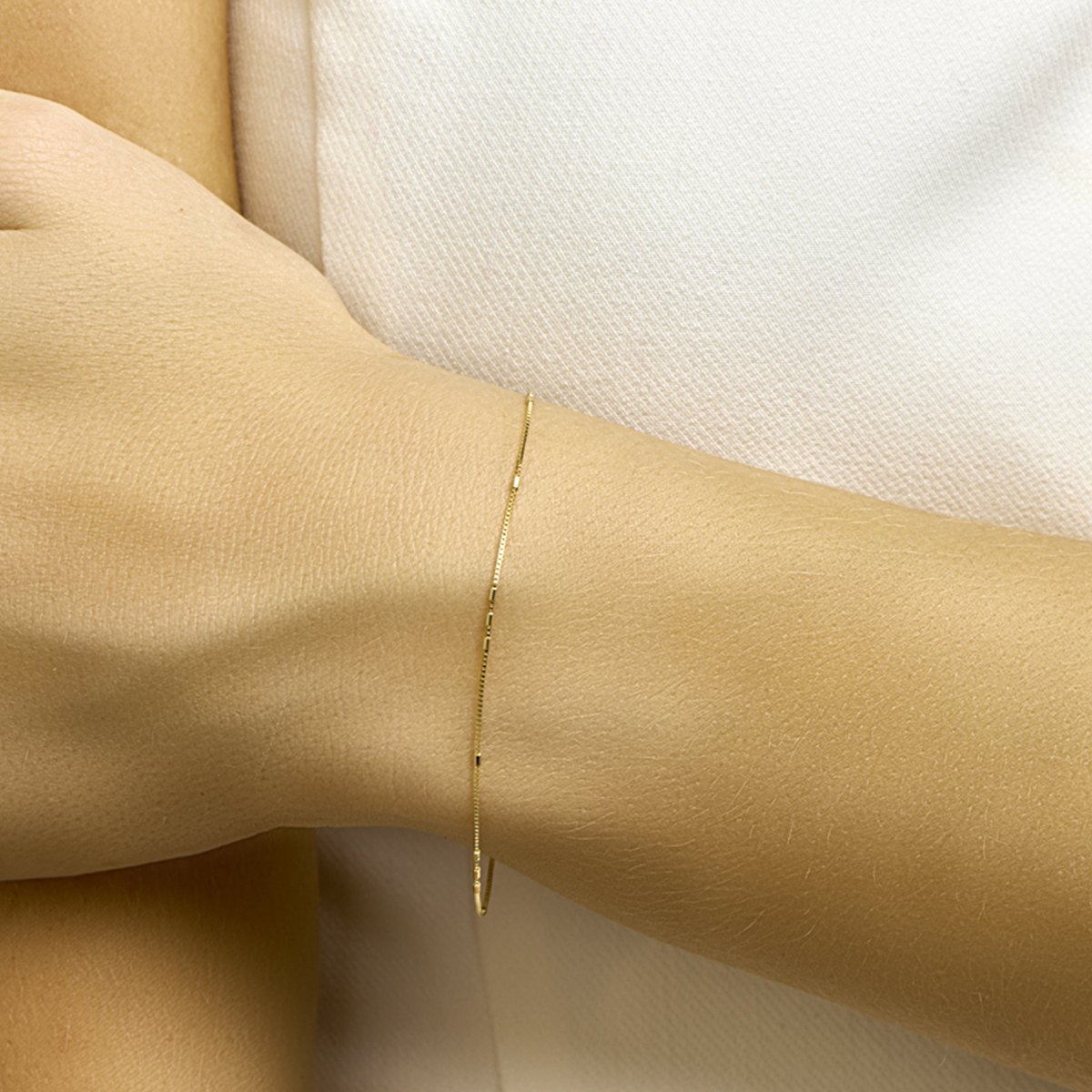 Geelgouden 0.9mm venetiaanse armband uitgevoerd met een patroon van kleine staafjes en sluit met een stevige veerring sluiting. De armband is te combineren met bijpassend collier uit onze collectie.
