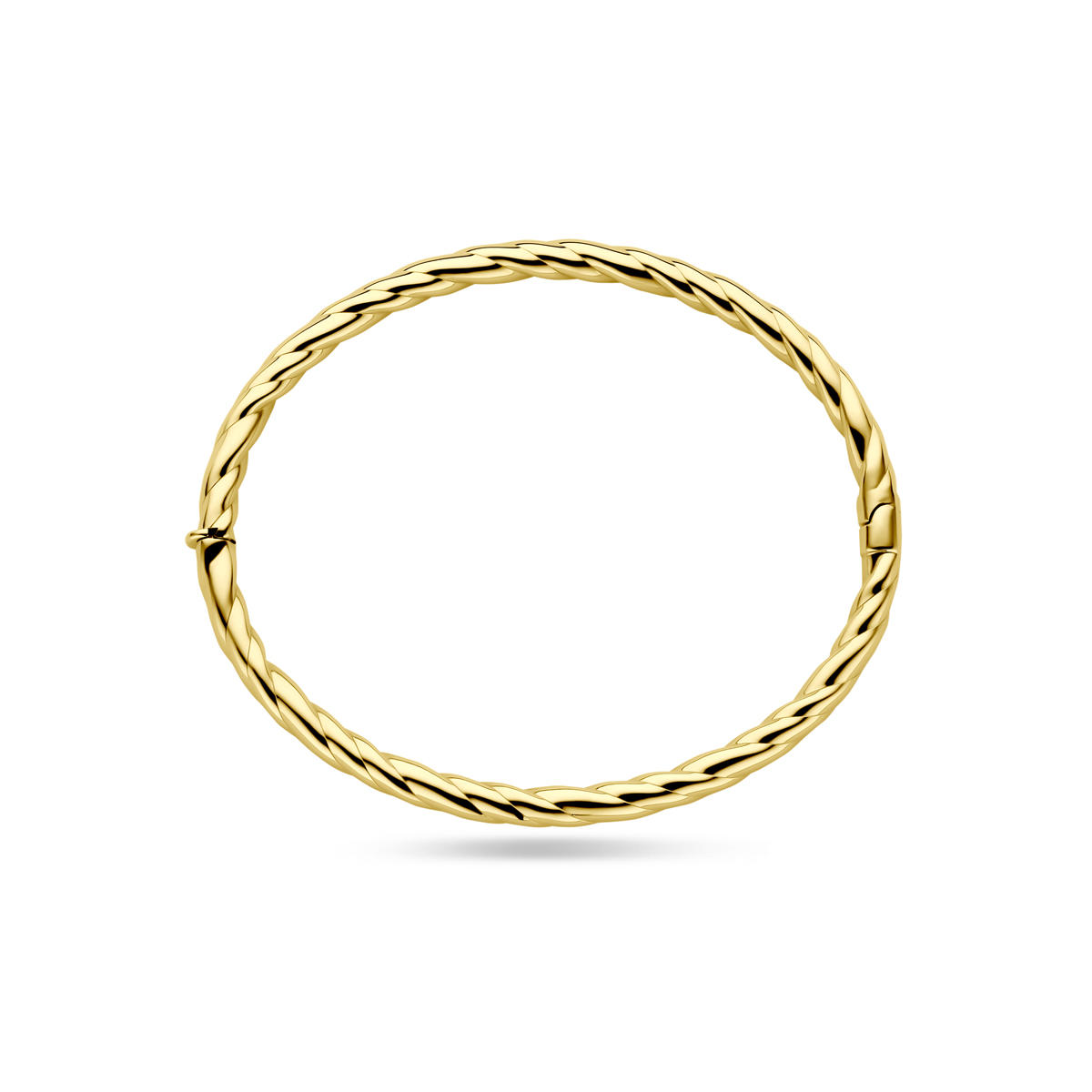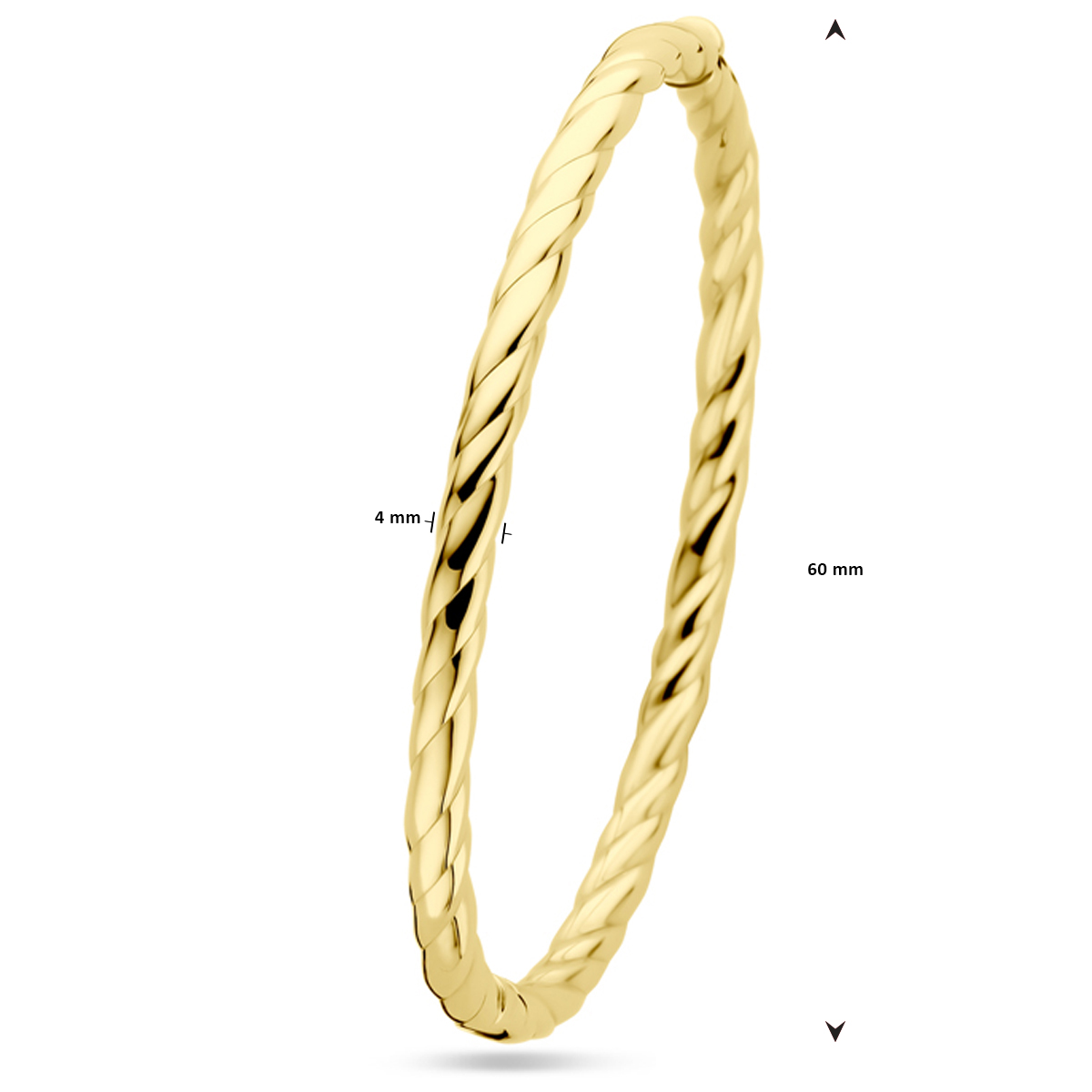 14k Geelgouden bangle uitgevoerd met een gedraaide buis. De bangle heeft een totale diameter van 60mm.