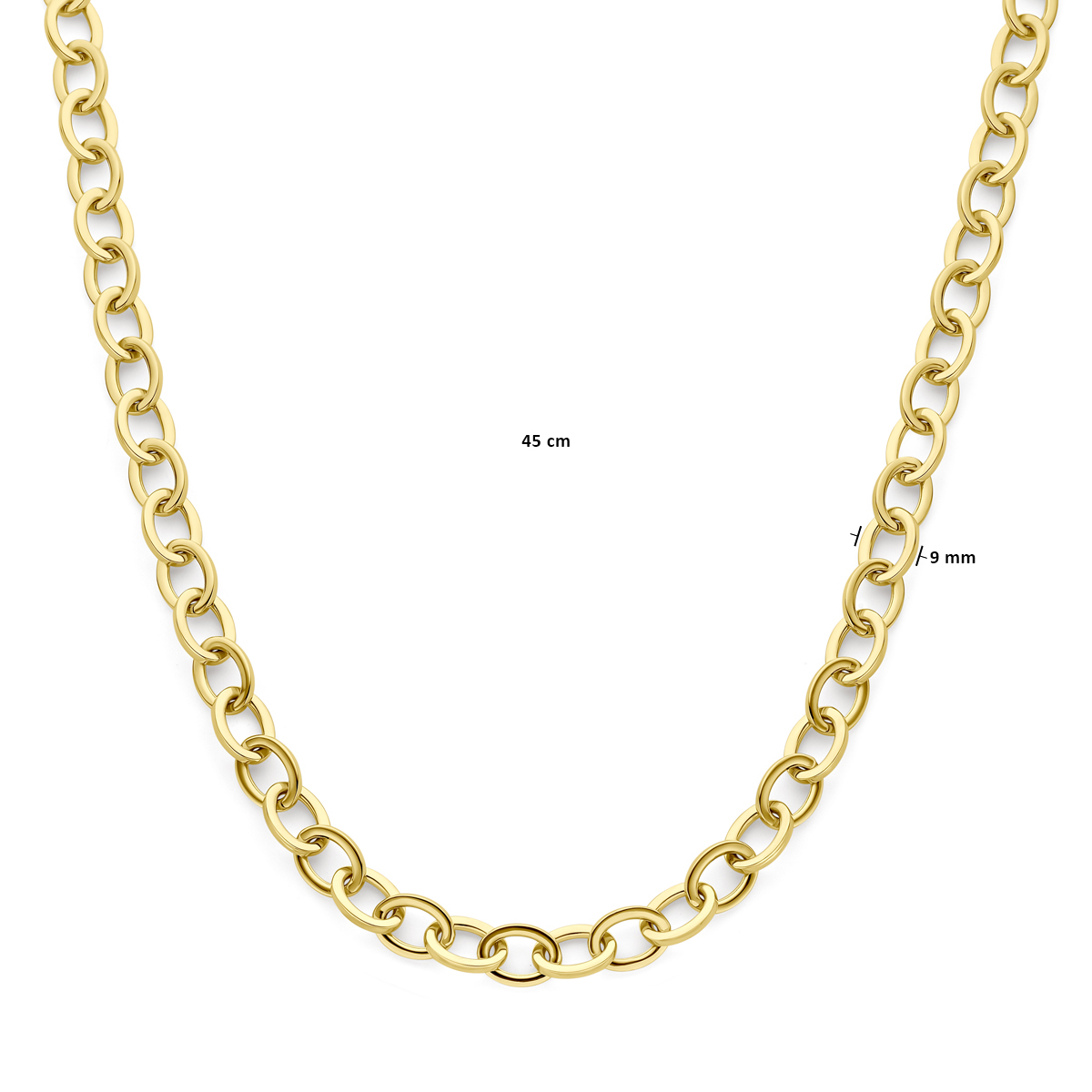 14k Geelgouden collier uitgevoerd met een karabijnsluiting. Het collier heeft een draaglengte van 45cm en de schakelbreedte is 9mm.