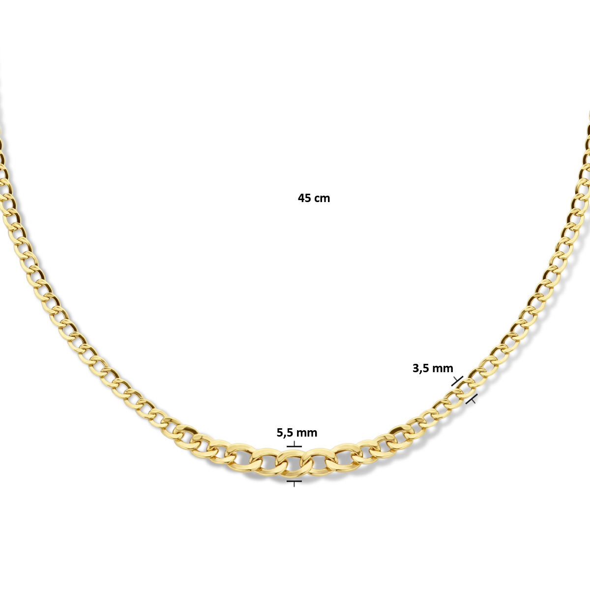 14k Geelgouden collier met gourmette schakels tussen 3.5 en 5.5mm. Het collier heeft een draaglengte van 45cm.