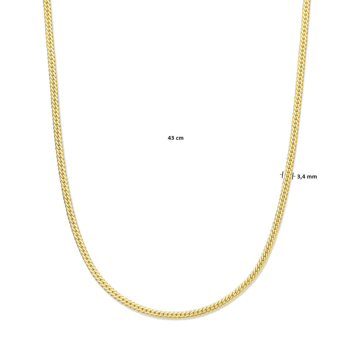 14k Geelgouden collier met een gourmette schakel van 3.4mm. Het collier heeft een draaglengte van 43cm en is uitgevoerd met karabijnsluiting.