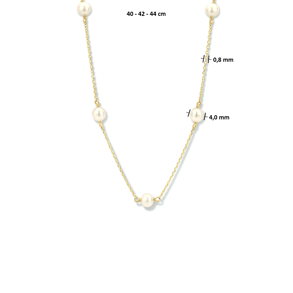 14k Geelgouden collier uitgevoerd met schitterende parels. Het collier heeft een breedte van 4mm en draaglengtes van 40, 42 en 44cm. De schakelbreedte is 0.8mm.