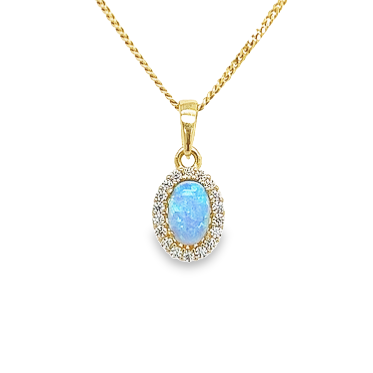 Deze hanger is ontzettend elegant. De ovaal geslepen steen is een blauw gekleurde opaliet geklemd tussen vier zetpoten. De kleine steentjes zijn briljant geslepen zirkonia's.
