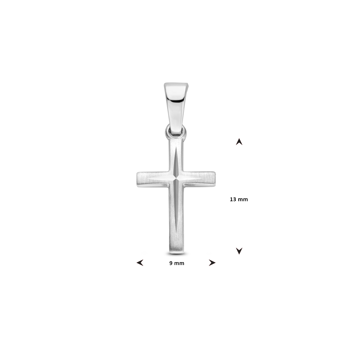 Gerhodineerd 925 zilveren hanger in de vorm van een kruis. De hanger heeft een totale hoogte van 20mm en een afmeting van 13x9mm.