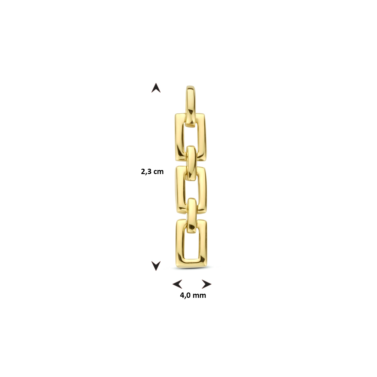 14k Geelgouden hanger uitgevoerd met een schakelmotief. De hanger heeft een totale hoogte van 2.3cm en een breedte van 4mm.