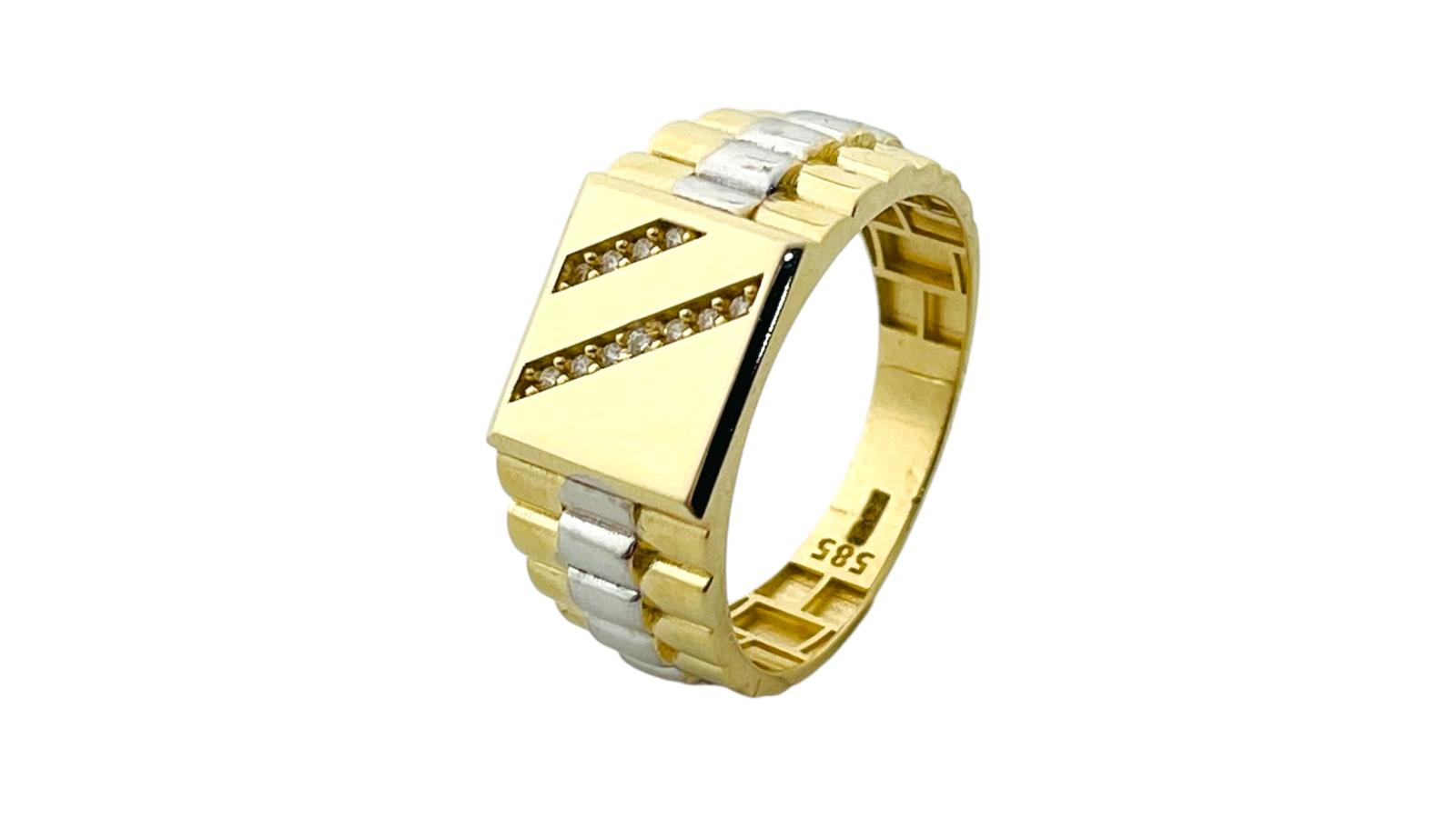 Deze prachtige herenring van 14 karaat goud combineert elegantie en verfijning, perfect voor de moderne man. Met een fraaie goud-zilvergekleurde afwerking is dit sieraad veelzijdig en stijlvol. Hoewel het gewicht niet is gespecificeerd, biedt de ring een luxueus gevoel. Draag de ring dagelijks of als aanvulling op een formele outfit voor een tijdloze uitstraling.