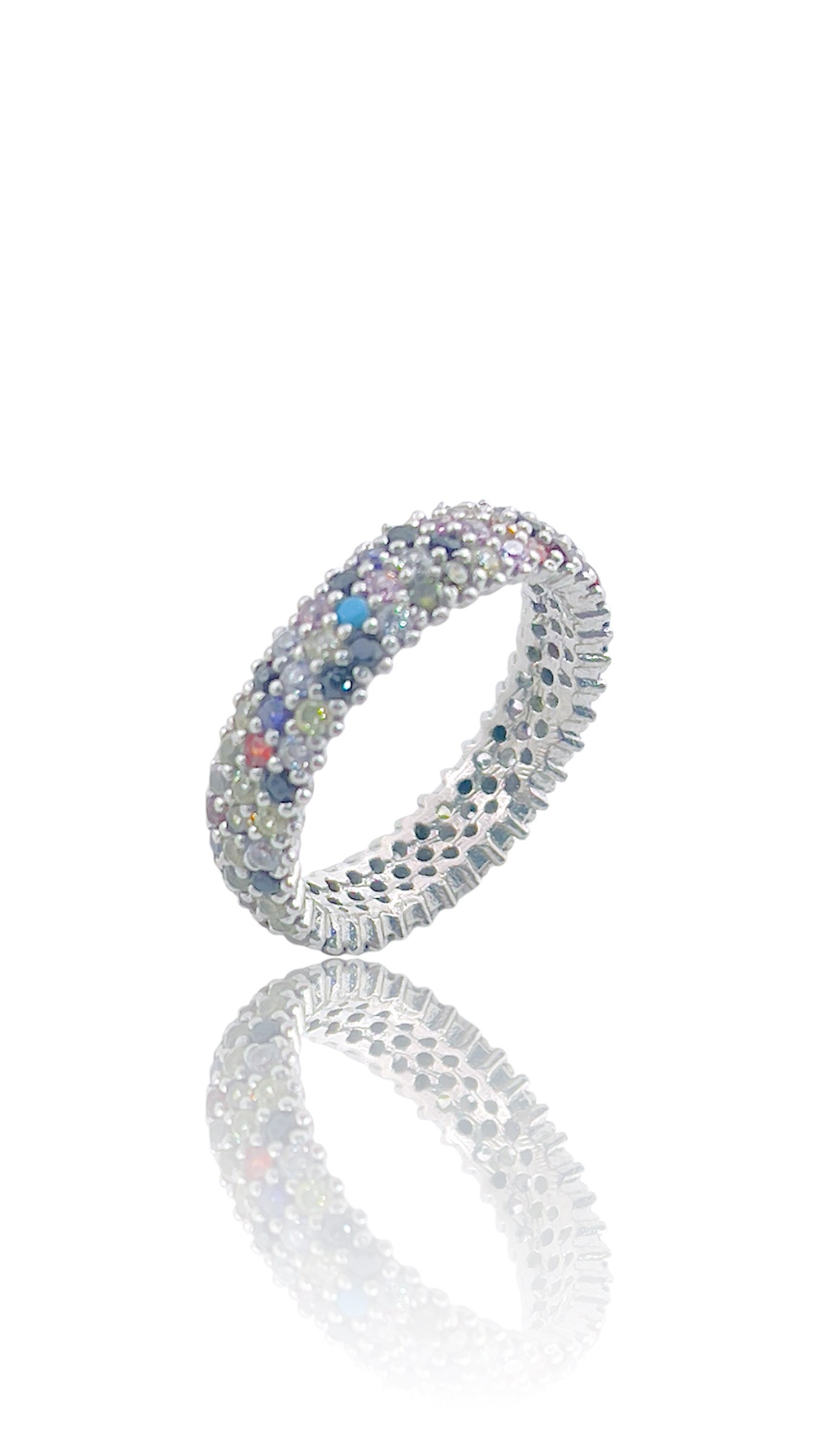 Deze prachtige regenboogring is rondom gezet met stralende stenen, waardoor het een ware eyecatcher is. De ring kan solo gedragen worden voor een subtiele touch of gecombineerd worden met andere ringen voor een statement look. De regenboogkleuren maken het gemakkelijk om te combineren met verschillende outfits en stijlen. Een must-have voor je sieradencollectie!