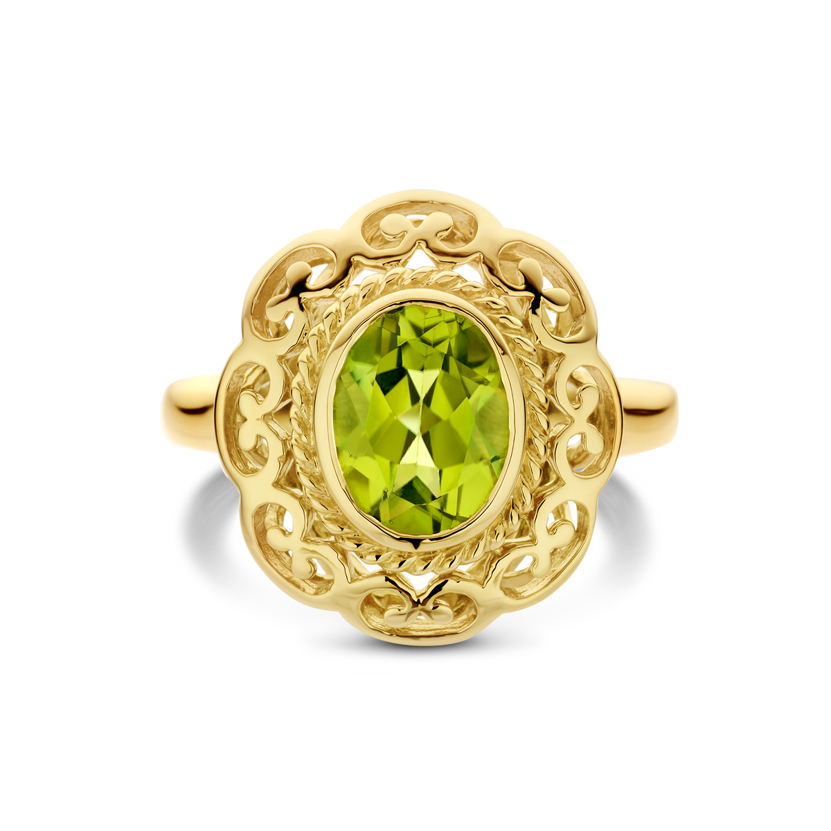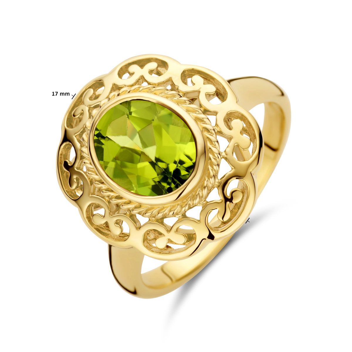14k Geelgouden vintage ring uitgevoerd met peridot. De ring heeft een breedte van 17mm.