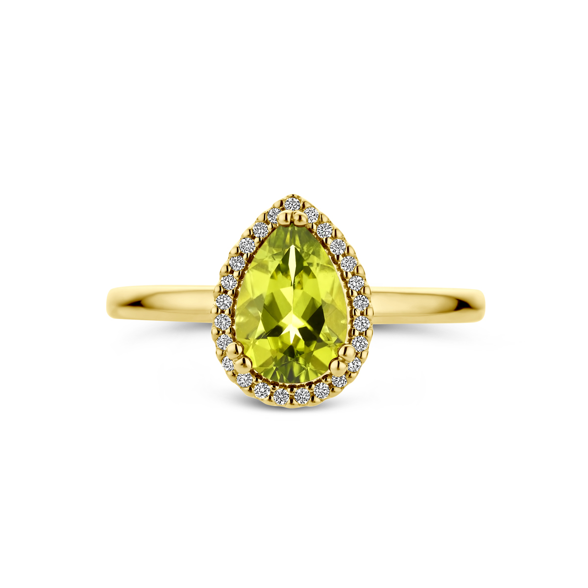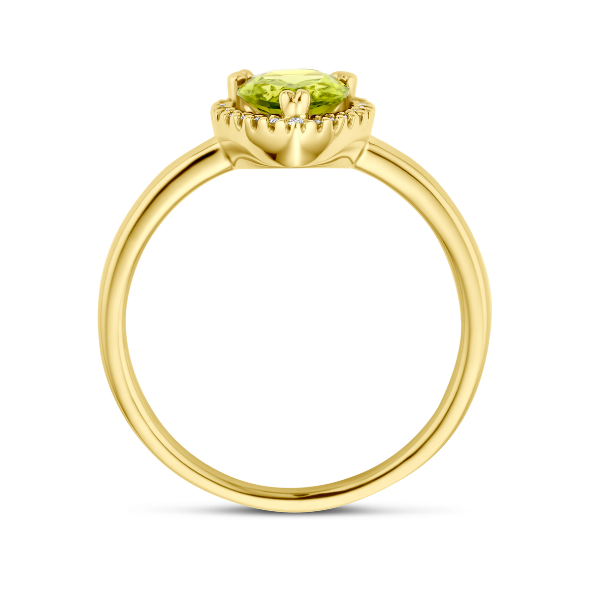 14k Geelgouden ring uitgevoerd met peridot en diamanten. De ring heeft een breedte van 11.5mm. Het diamantgewicht is 0.08ct.