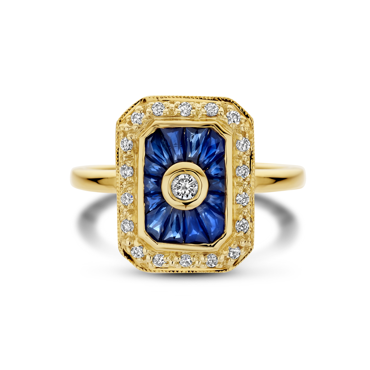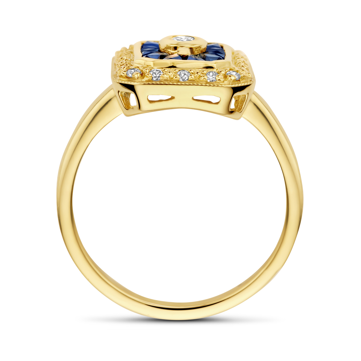 14k Geelgouden vintage ring uitgevoerd met saffier en diamant. De ring heeft een breedte van 14.5mm. Het diamantgewicht is 0.25ct.